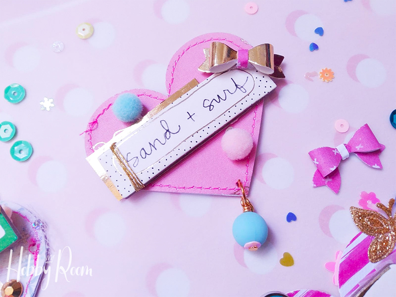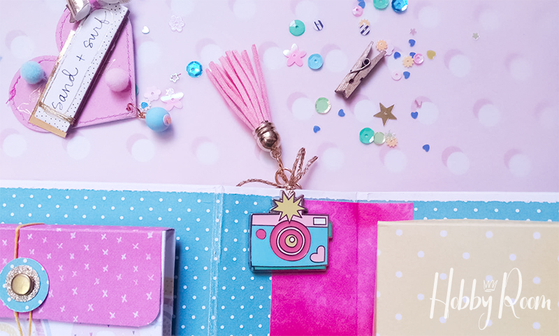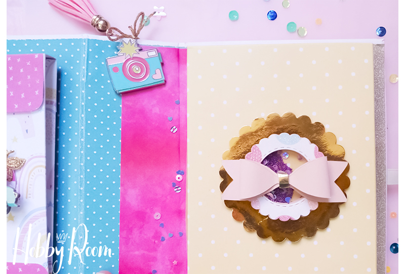 את הכריכה דיגמתי בדף קשתות טרנדי מקולקציית הבית של הובי רום, את הדף קישטתי במדבקות צ'יפבורד על מנח טול נקודות מזהב. קשרתי לשדרה החיצונית טאסל ורוד, ובחלק הפנימי של השדרה הצמדתי סיכת מצלמה מעלפת של My mind's eye מהקולקציה: Good Vibs המשגעת!