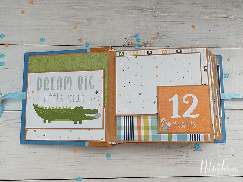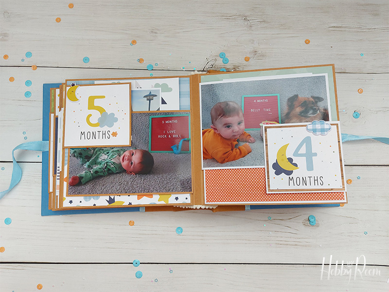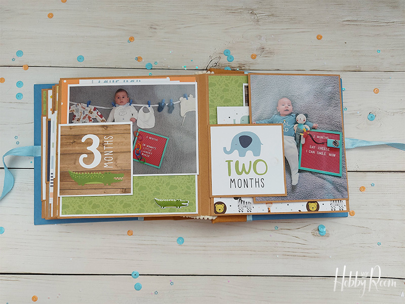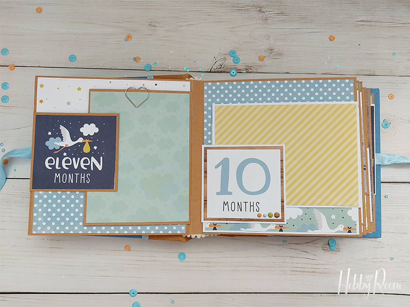 כדי שלא יווצר מראה לא גמור השתמשתי בדפים מדוגמים, אותם מיקמתי היכן שאדביק את התמונות החודשיות, ובהמשך המדוגמים האלו יהפכו להיות כרטיסיות שבהן ארשום זכרונות וחוויות.