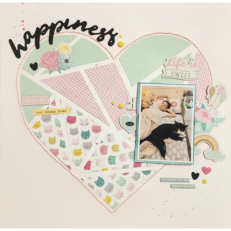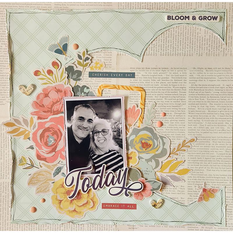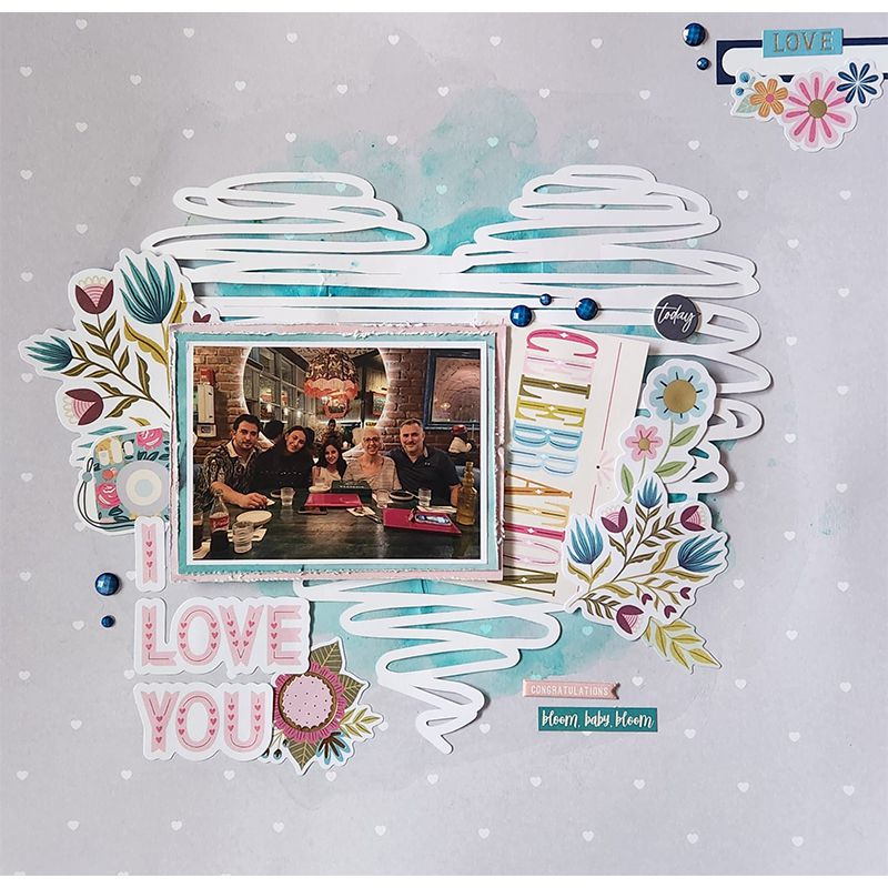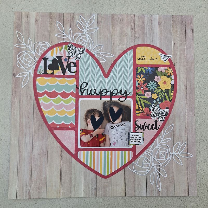 מצאתי 2 דפים מקולקציות שונות שהשתלבו לי ממש יפה, חתכתי בסילואט לב בקצה הדף והשתמשתי בפרחים מקולקציה ישנה של סימפל סטוריז שאני ממש אוהבת. הצבעים של התמונה היו די רועשים אז הפכתי אותה לשחור ולבן והוספתי 2 נגיעות שחור בכותרת הקטנה למעלה ובזו שעל התמונה.