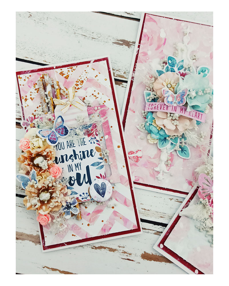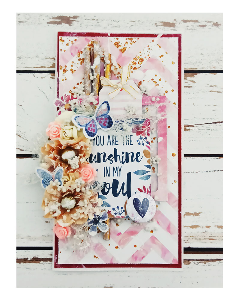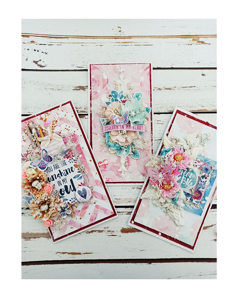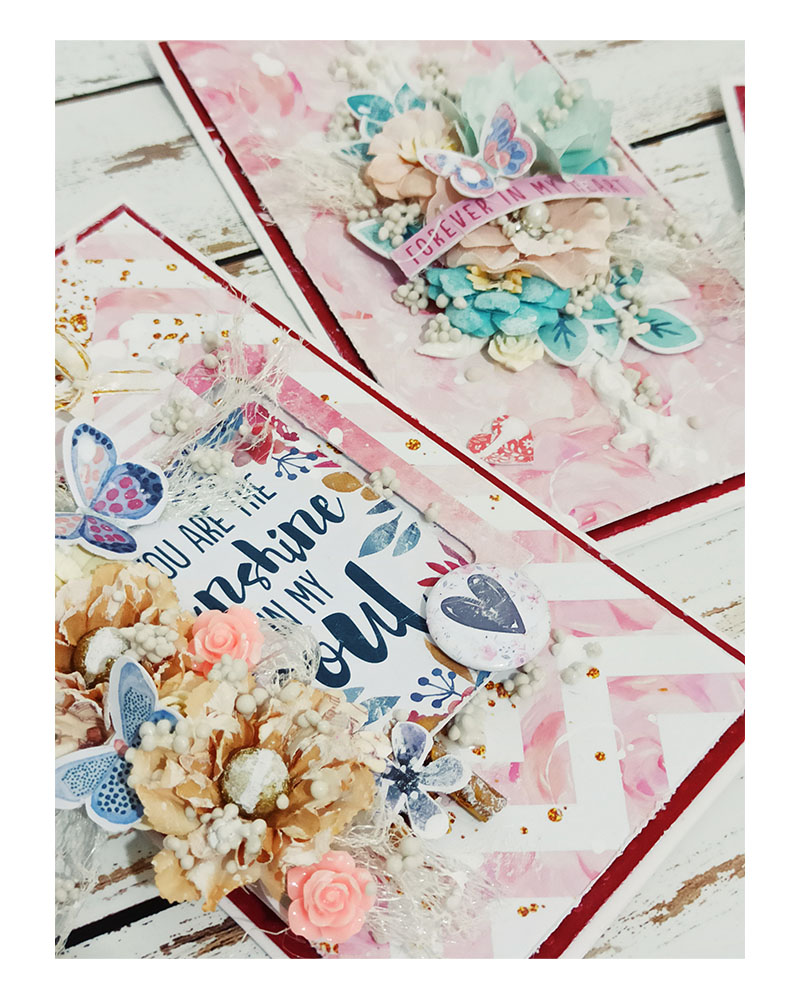 הכרטיסים בנויים בטכניקת השכבות כאשר השכבה התחתונה מהסטאק שושנים בכפר היא הבסיס שלי לבניית הקומפוזיציה.