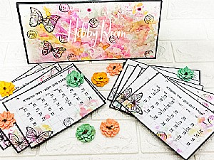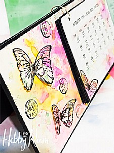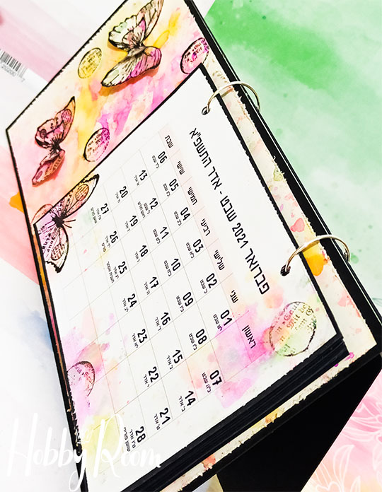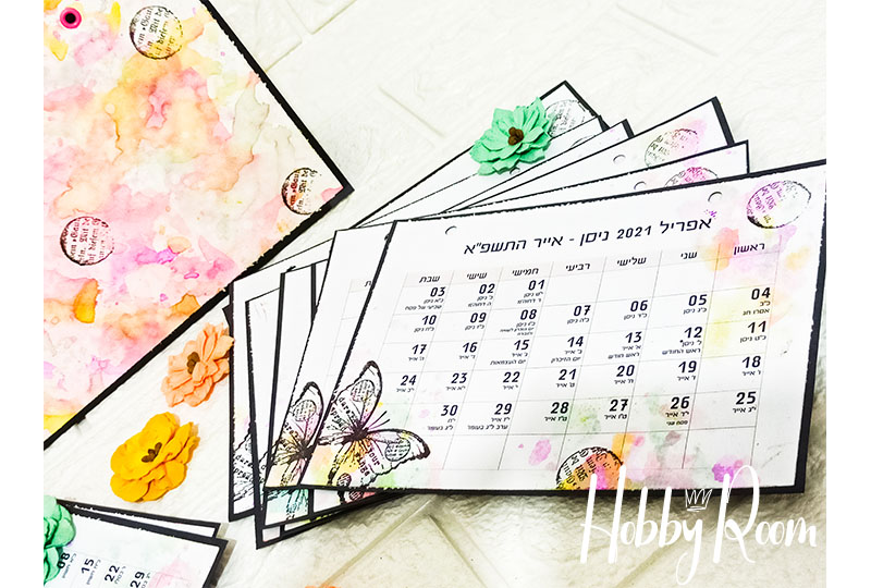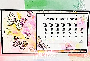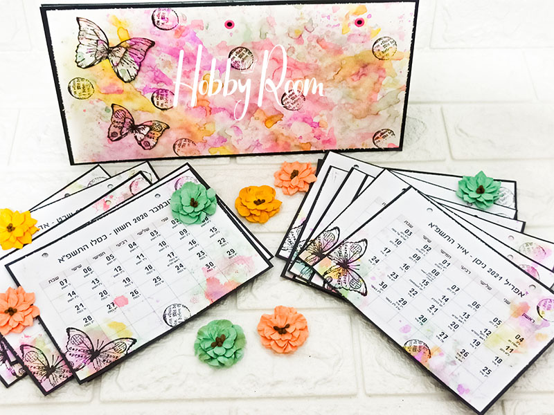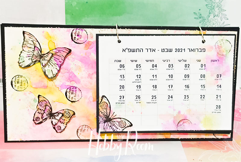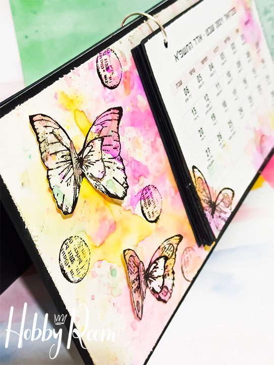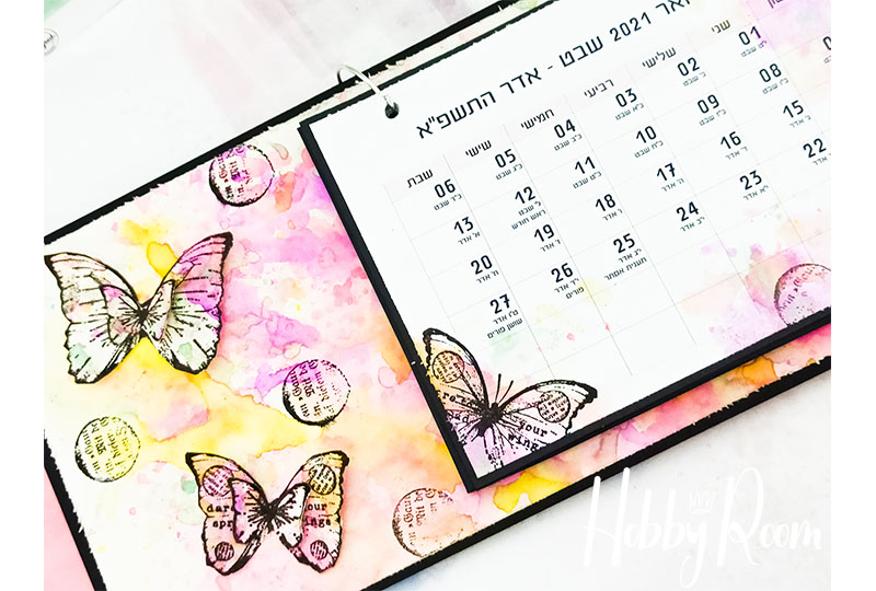 לקישוט השתמשתי במוטיב חוזר של חותמות פרפרים, אותם החתמתי על כל כרטיסיות לוח השנה כי אין יותר קיצי מזה.