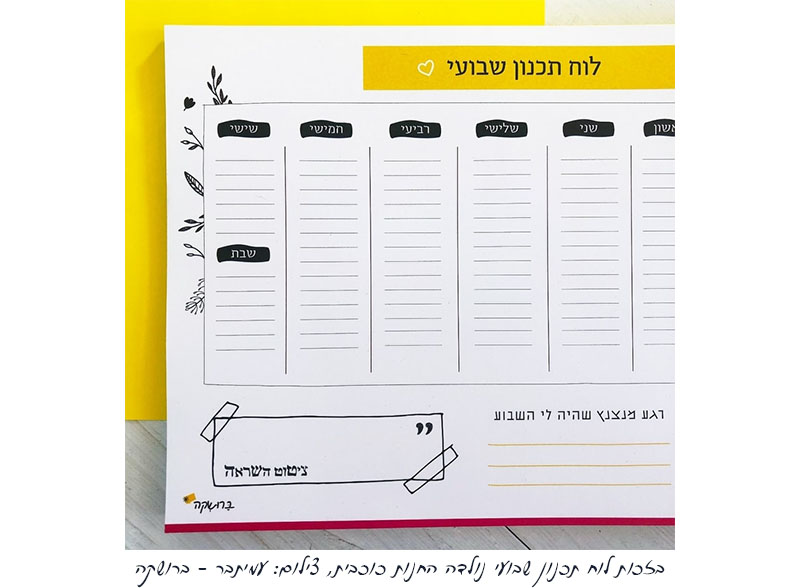 אחרי שכתבתי כשנתיים למגזינים ועסקים נוצצים במיוחד חיפשתי עבור עצמי כעצמאית לוח תכנון שבועי, ואיך בעלי תמיד אומר עליי: "עוד לא המציאו את מה שאת מחפשת" וזה נכון! יש לי איזה משהו בראש שאני מדמיינת ואז אני מתחילה לחפש אותו, בדרך כלל אני לא מוצאת בדיוק את מה שאני מחפשת ויוצרת אותו בעצמי. זה קורה כשאני מעצבת לילדים שלי את ימי ההולדת, כשבא לי בגד חדש או בכל תחום. אחרי שעיצבתי לעצמי לוח תכנון שבועי החלטתי לקחת את זה צעד אחד קדימה ולעצב ליין שלם של מוצרים עם טביעת הזיהוי שלי, של ברושקה, וככה נולדה החנות כוכבית. מהר מאוד חשבתי גם על מדבקות ליומן בעברית בוייב הומוריסטי, מחברות מהממות (אני סופר אובייקטיבית), פנקסי רשימות ועוד מוצרים – כשאת הכל עוטפת אנרגיה מנצנצת ומשמחת, כי אתן זוכרות שאמרתי שאני מפזרת נצנצים ביקום, נכון?