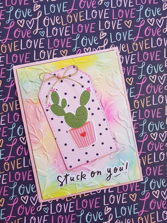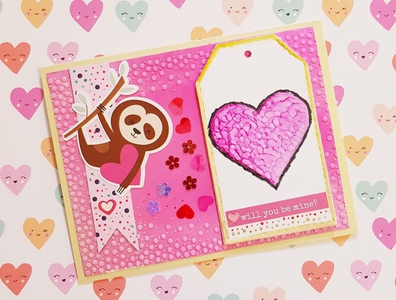 בכרטיס השתמשתי בדף בסיס בגוון ורוד עז. המשכתי להבלטה קרה של נקודות, אותן הבלטתי עוד יותר עם משיכות של כרית דיו לבנה. התגית היא "תגית שייקר לעצלנים" וסדר החיבורים שלה, התבלבל והתפצל מרוב אהבה. התגית מוגבהת עם דבק דו"צ ספוגי (והלב שבתוכה נצבע עם מרקר אלכוהולי), השקף נצבע בגוונים ורודים-אדומים ובעזרת פאנץ קטן, לבבות השקף הונחו לצד הפאייטים. לסיום הוספתי קצת (הרבה?) נקודות פה ושם והדבקתי את מדבקת העצלן המאוהב מסט המדבקות של קולקציית Sweet talk.