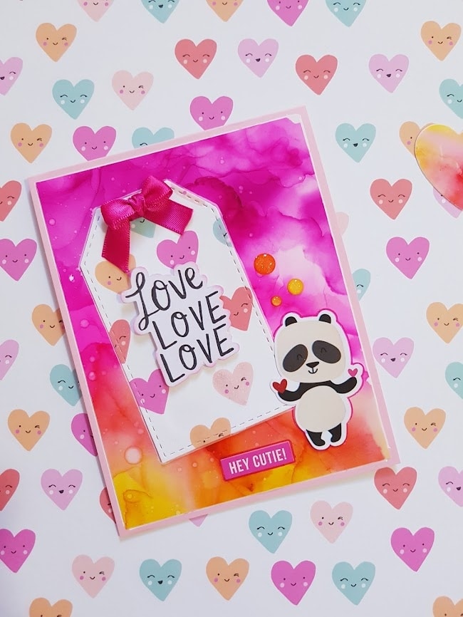 בכרטיס זה לא השתמשתי כלל בתבנית הבלטה, אך השתמשתי באחד החומרים שאני הכי אוהבת לעבוד איתם – הדיו האלכוהולי. על דף מינרלי שילבתי גוונים שמסמלים את חג האהבה. חתכתי תגית מתוך אחד הדפים המעוצבים של Happy hearts ועם דבק ספוג דו"צ שילבתי כיתוב תואם, מחיתוכי הקארדסטוק של הקולקציה. מדבקה מתוקה להפליא מתוך הקולקציה של Simple stories – Sweet talk עם מדבקה תואמת, נקודות אפוקסי וסרט תואם והכרטיס השלישי מוכן!