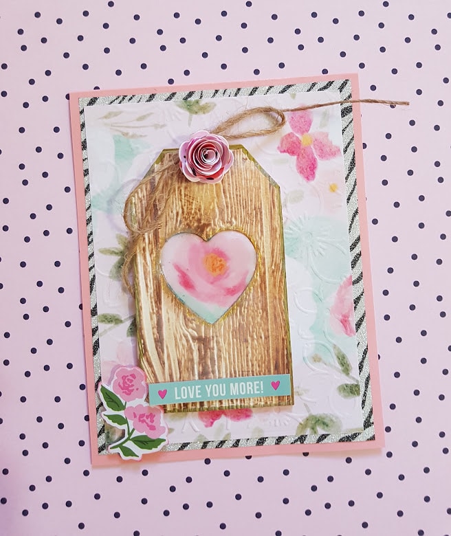 בכרטיס זה רציתי להכניס קצת את הטבע המופלא והאהוב לעניינים. על הכרטיס עצמו הדבקתי דף מעוצב של זברה, מעליו את אחד הדפים הרומנטיים והפרחוניים של Hobby Room, מתוך הסטאק במיוחד בשבילך/ממני באהבה, לאחר שיצרתי בו הבלטה עדינה של פרחים. חתכתי תגית וגם בה השתמשתי בהבלטה קרה, הפעם של עץ ולאחריה צבעתי בגוון תואם. עם חותכן של לב יצרתי לב בתוך התגית והדבקתי מאחוריה פרח קסום, שהובלט עם Glossy accents , לא לפני שעברתי מסביב לחיתוך הלב עם טוש זהב. להמשך המראה הטבעי, השתמשתי בחוט שמשון לעיטור התגית והדבקתי מעליו פרח קטן שחתכתי וגלגלתי מתוך דפי הקולקציה של Happy hearts. לסיום הוספתי מדבקה תואמת מהקולקציה והדבקתי עם נקודות דבק ספוגיות חיתוך קארדסטוק פרחוני תואם.