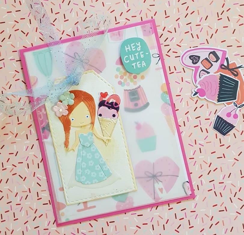 השתמשתי בדף המעוצב המתוק תרתי משמע מתוך הקולקציה של Simple stories – Happy hearts, מעליו הדבקתי וולום בגוון ניטרלי. חתכתי תגית מדף לצבעי מים, עליה התזתי ספריי שימר ובשוליים ומרכז התגית עברתי עם כרית דיו מוזהבת עדינה. הדבקתי את הדמות החמודה שיצרתי מסט חותכנים והכנתי לנסיכת האגדות גלידה שנעשתה מחיתוך בצורת לב של שלושה דפים מעוצבים מתוך הקולקציה הנ"ל. עברתי על לבבות הגלידה עם Glossy accents והוספתי מעל מדבקת לב טעימה במיוחד. שילבתי כיתוב תואם מחיתוכי הקארדסטוק של הקולקציה ועיטרתי בסרט נסיכותי תואם.